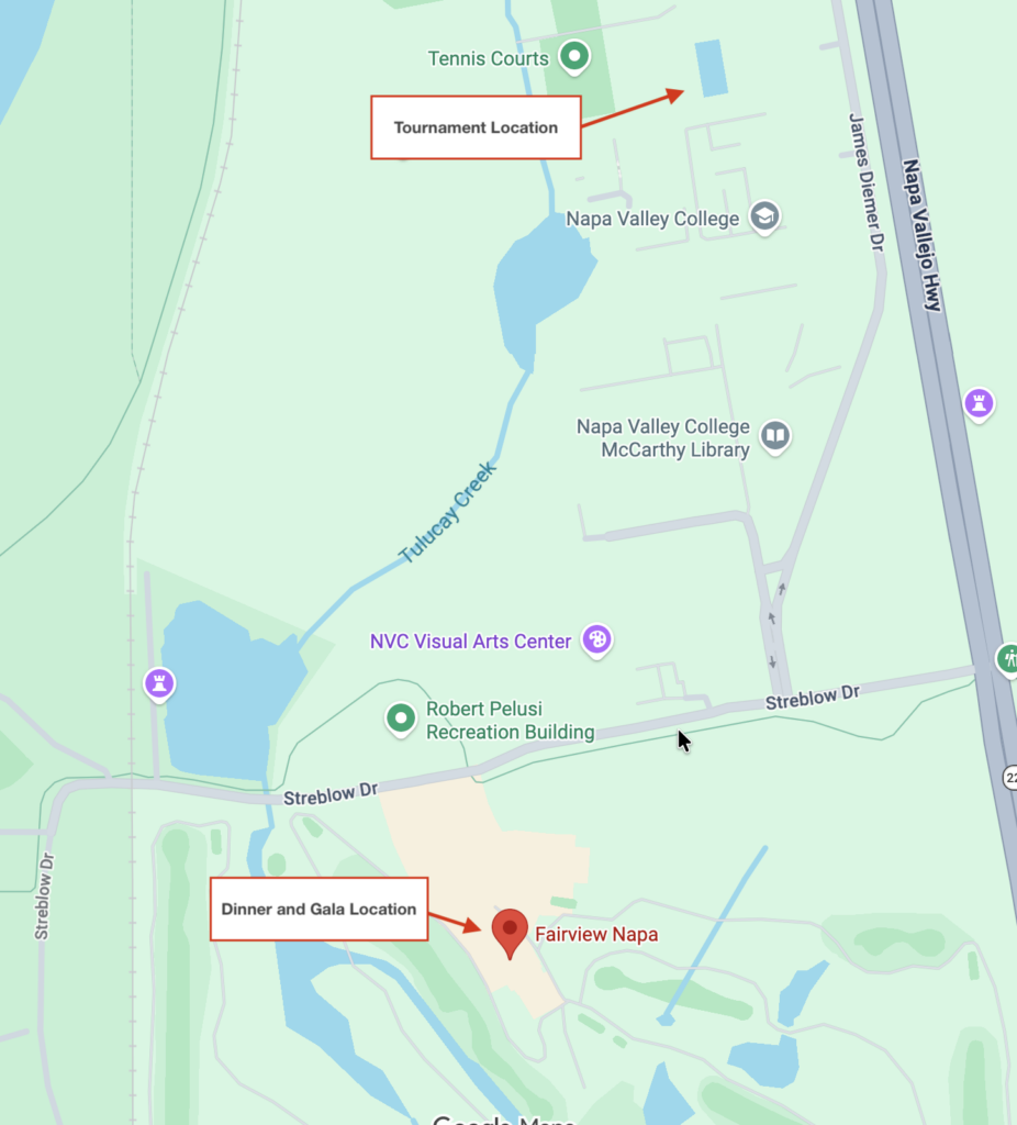This year’s Dinner Gala will be held at Fairview Napa (part of the Napa Golf Course) on Saturday, July 11 from 6pm – 10pm. This venue is just south of Napa Valley College, where the tournament will be played.